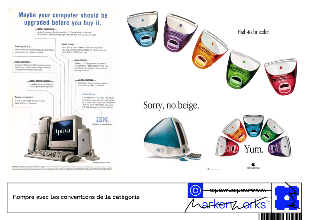 Mais c’est en développant ses codes de marque par opposition à la norme de la catégorie qu’Apple se distingue immédiatement dans l’esprit du consommateur et que sa proposition est considérée.
